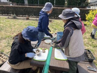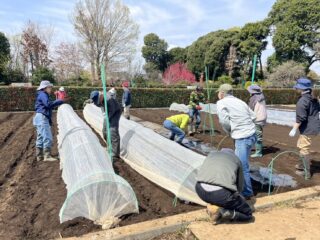 また、6月29日(日)に開催予定の農の学校10周年記念の中で行われる野菜の収穫体験会の準備として、3月30日(日)に11名のサポーターがジャガイモの種芋植え付けなどを手伝ってくださいました!一緒にエダマメやトウモロコシの播種も手伝っていただいて、すべて午前中に終わることができました。